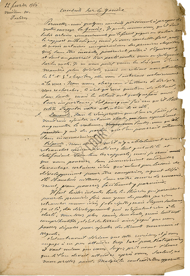 Estoy de acuerdo con usted en que tiene que hacer algunos cambios que le harán ganar en valor metódico; pero le aconsejo encarecidamente que revise algunas comparaciones de los primeros capítulos que, sin ser inexactos, podrían prestarse a equívocos, y de los cuales se podría sacar provecho en su contra, al epílogo de las palabras. No quiero señalarlas de manera especial, pero releyendo con atención los capítulos segundo y tercero, sin duda le saltarán a la vista. Nos encargaremos de dirigir su investigación. Es sólo una cuestión de detalle, sin duda, pero los detalles a veces también son importantes; por eso creo que es útil llamar vuestra atención sobre esto.