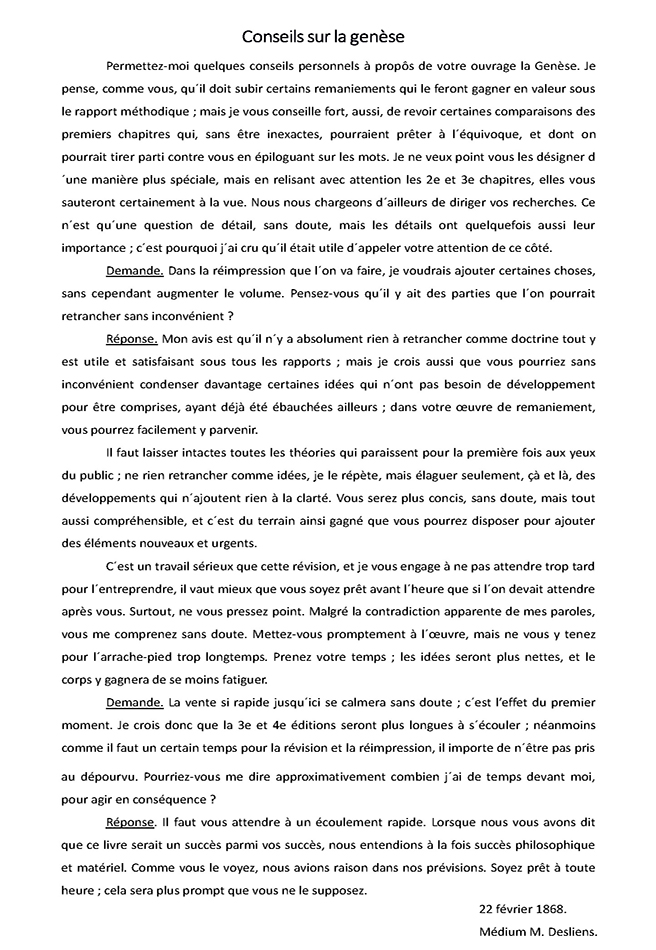 Una parte más condensada de esta comunicación aparece en el libro Obras Póstumas. Guiándonos de esta obra el Espíritu comunicante sería el Dr. Demeure, que en tantas otras ocasiones ha dado recomendaciones a Allan Kardec sobre su salud. Si bien en Obras Póstumas aparece atribuida al médium C., y observamos en este manuscrito que Allan Kardec coloca Médium M. Desliens. En Obras Póstumas encontramos también una comunicación atribuida al Dr. D., posiblemente el Dr. Demeure, recibida por el Médium D., del 9 de septiembre de 1867, en relación igualmente al libro La Génesis que se publicaría poco después, en enero de 1868.