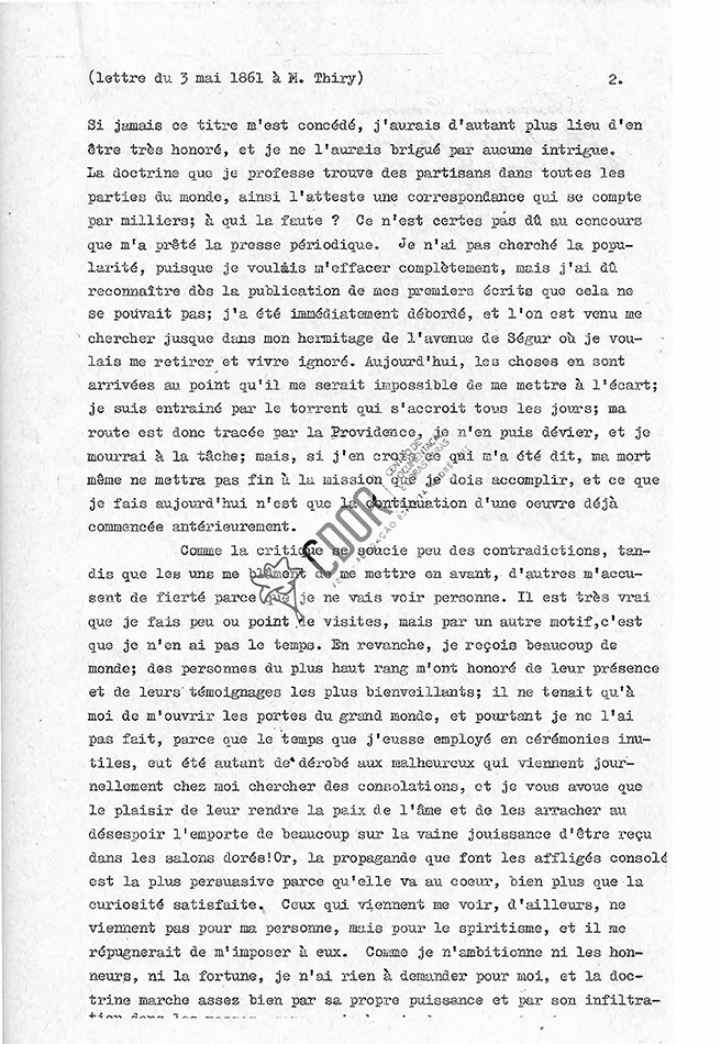 Me reprochan que me coloque como jefe del movimiento. Si algún día me fuese concedido ese título, tendría motivos de honra, especialmente por no haberlo obtenido fruto de ninguna intriga. La doctrina que profeso encuentra partidarios en todas partes del mundo, como lo atestigua una correspondencia que se contabiliza por millares. ¿Quién tiene la culpa? No será por cierto debido al concurso que me prestó la prensa periodística. No busqué la popularidad, visto que me quise apagar completamente, pero debo reconocer que desde la publicación de mis primeros escritos eso no fue posible. Me sentí atosigado de inmediato, la gente vino a procurarme hasta en mi ermita de la Avenida de Ségur, donde quería retirarme y vivir ignorado. Hoy las cosas han llegado al punto de que me sea imposible hacerme a un lado. Fui arrastrado por el torrente que aumenta día a día. Mi rumbo está pues trazado por la Providencia, no me puedo desviar de él y moriré en mi tarea. Pero, si doy crédito a lo que se me ha dicho, incluso mi muerte no pondrá fin a la misión que debo cumplir, y que lo que hoy hago no es sino continuar una tarea ya iniciada anteriormente.